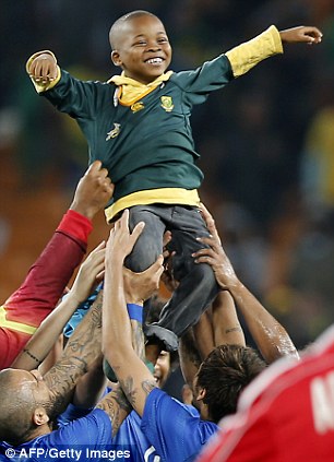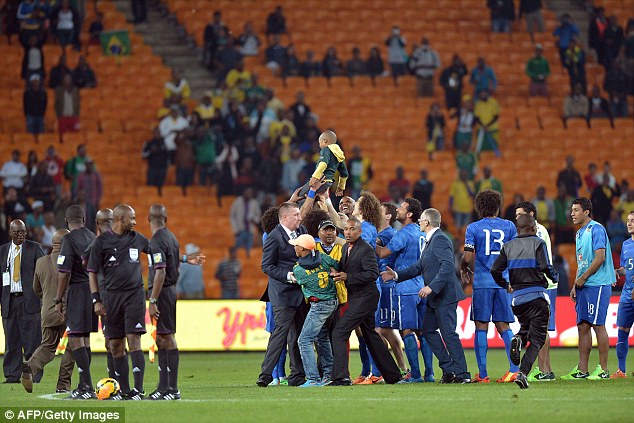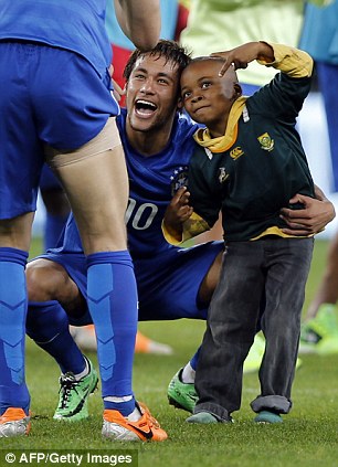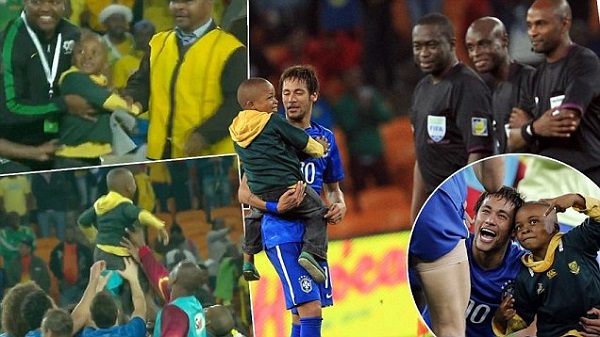 After South Africa lost 5 – 0 to Brazil on Wednesday, March 5, 2014 in Soweto, South Africa, a young South African lad who ran onto the pitch after the match was chased by the stewards. Luckily for him, he was rescued by Brazilian Barcelona star Neymar who letter posed with the lad for some pictures.