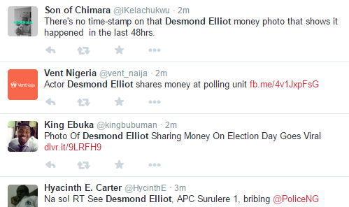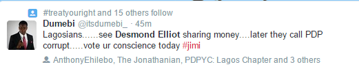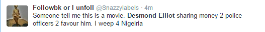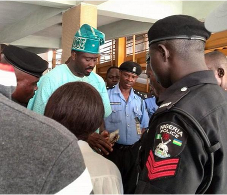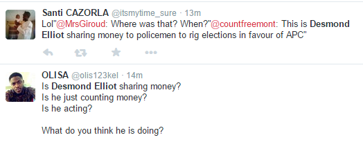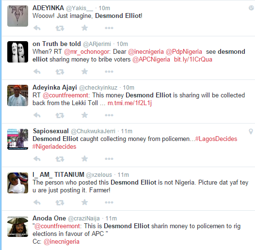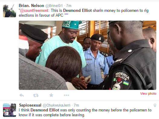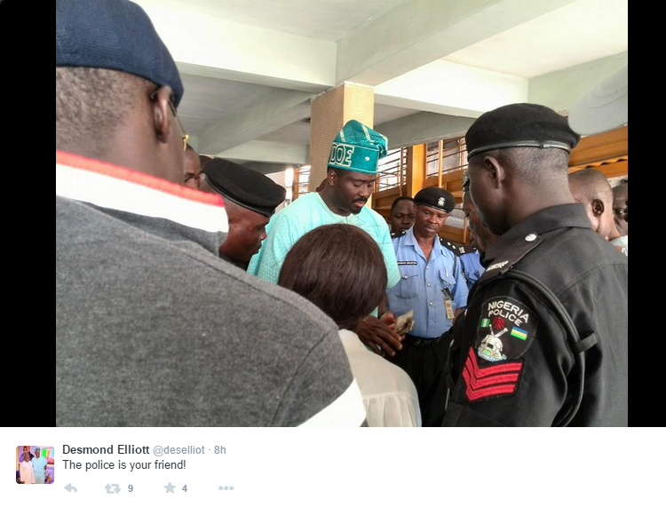 In the photo, Desmond appears to be sharing money to people including policemen at a recent campaign rally in his Surulere Constituency. He shared the photograph on Twitter with the caption ‘The Police Is Your friend’.