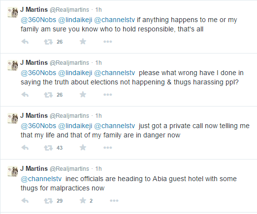 J Martins has just tweeted that he received a call from an unknown number threatening him and his family over his earlier reports of election malpractice in Abia State.