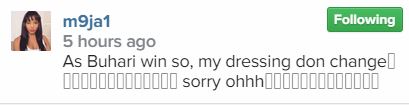 Aside posting new photos, which happen to be among the few where she is not showing a part of her body or the other, she is hinting at a change in dressing following retired General’s victory. She hinted at this via an Instagram post today, April 2, 2015, where she is seen dressed as a Muslim to celebrate Nigeria’s next President, who was declared winner by INEC on Wednesday, April 1, 2015.