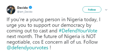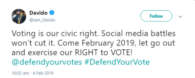 Valid question one must note. Why? Prior to the elections, Nigerian international pop star, Davido was perhaps the most vocal celebrity on matters related to voter awareness and youth participation. “If you’re a young person in Nigeria today, I urge you to support our democracy by coming out to cast and #DefendYourVote next month. The future of Nigeria is NOT negotiable, cos E concern all of us.”, the singer tweeted on January 29, revealing his involvement with ‘Defend Your Vote’, an initiative that championed youth participation and consciousness per the elections.