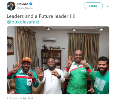 Recall that on February 14, Davido shared a photo of himself and two PDP chieftains, one of which is the Senate President, Bukola Saraki. The singer captioned; “Leaders and a Future leader !!!!”