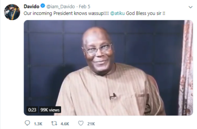Davido had on February 5 tweeted and posted on Instagram; “Our incoming president knows wassup” along with a video that saw the PDP presidential candidate refer to the singer as the “ruling king”. Weeks leading up to the elections, Davido performed at the Presidential rally of the PDP in Rivers state, posed with Senator Bukola Saraki, a chieftain of the PDP and donned in customised PDP inscribed shirts, all while representing the “non-partisan” Defend Your Vote initiative.