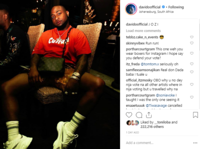 On February 4, Davido tweeted; “Voting is our civic right. Social media battles won’t cut it. Come February 2019, let go out and exercise our RIGHT to VOTE!”. But on February 23 when Nigerians went to the polls, Davido was nowhere to be found. Hours before the elections, the singer shared a photo on Instagram that was geotagged, Johannesburg, South Africa. As photos of celebrities from their polling units circulated on social media, no photo of Davido was seen. The singer was a no-show.