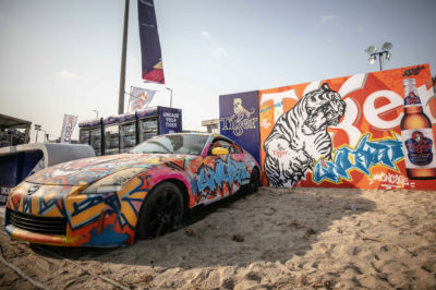 The corner featured a graffiti wall, as well as a car covered in very colorful graffiti. The beer brand pulled no stops in providing the ambiance to match its very ambitious brand narrative.