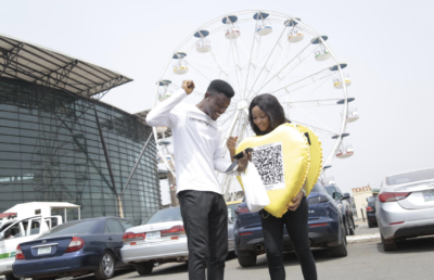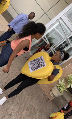 At first, most shoppers at the Polo Park Mall, Enugu, were curious as to what was going on, ‘wetin dem dey do wey dem wear love like this’? That was the question one of the shoppers asked and she was told she could win a prize by scanning the QR code on the costume. Interesting she said and quickly brought out her phone; who doesn’t love freebies?