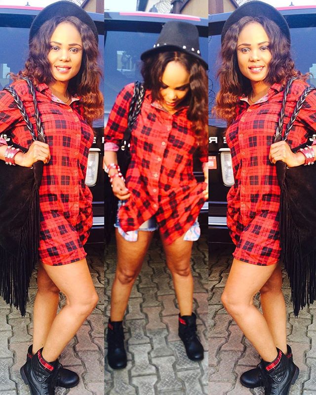 Sporting red tartan shirt dress, fedora hat and high top boots, Iyabo Ojo was the cynosure of all eyes as she walked into the mall, we learnt.