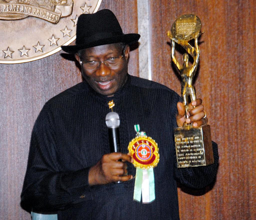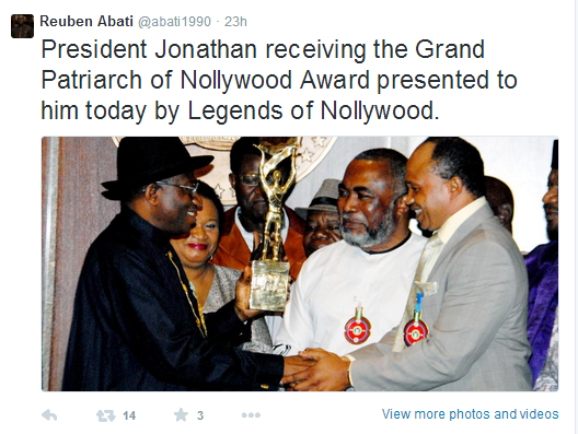 The information was shared on social media by Reuben Abati, Special Adviser to the President on Media and Publicity with a picture of the Nollywood Legends presenting the award to President Jonathan.