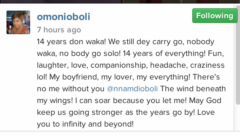 Celebrating her huge milestone, the actress excitedly shared a picture of the couple, taking a line from a song by Styl-plus titled 4 Years as part of the caption but not without changing the line to ’14 years’ thus: ‘14 years don waka! We still dey carry go, nobody waka, no body go solo! 14 years of everything! Fun, laughter, love, companionship, headache, craziness lol! My boyfriend, my lover, my everything! There’s no me without you Nnamdi Oboli The wind beneath my wings! I can soar because you let me! May God keep us going stronger as the years go by! Love you to infinity and beyond! #Happy14anniversaryTheObolis #Wekeepgoingstrong #WeareRoyalty.’