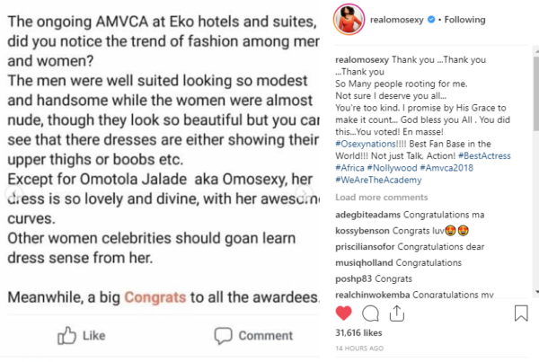 However, for Nollywood veteran actress, Omotola Jalade-Ekeinde who won an award at the event, apart from the congratulatory messages she has been getting, was commend by a fan for her modest dress sense, stating that most of the females that came for the award ceremony were almost nude with either their boobs showing or upper thighs.