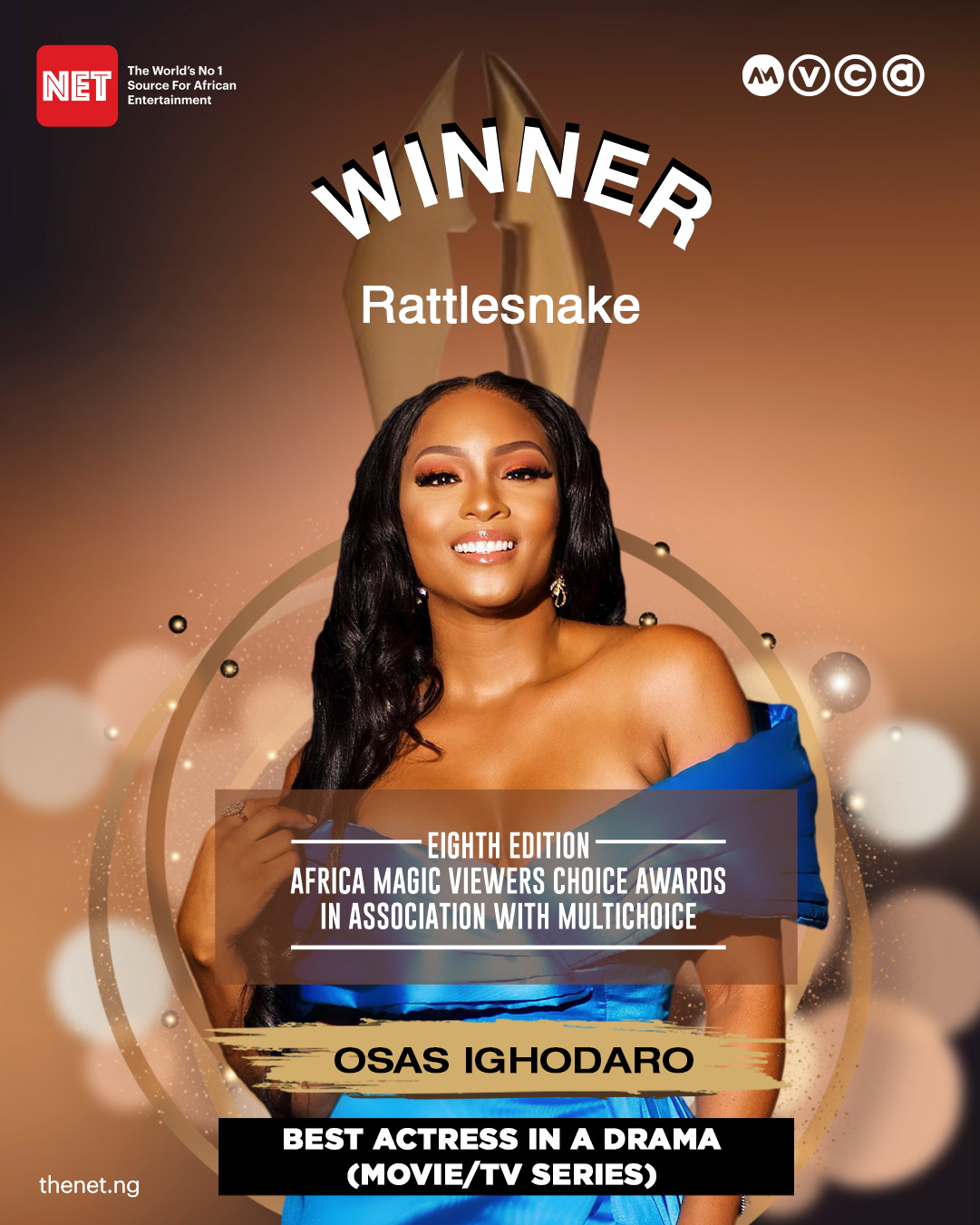 Osas Ighodaro was announced as the winner of the best actress award at the eighth edition of the Africa Magic Viewers Choice Award.