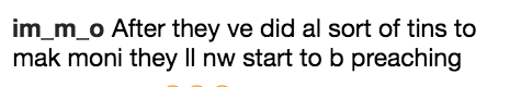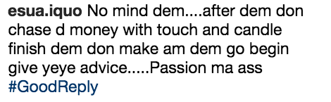 ‘After making your own money, you are now advicing me to chase passion,’ a Twitter user responded. ‘Which passion, passion of Christ?’