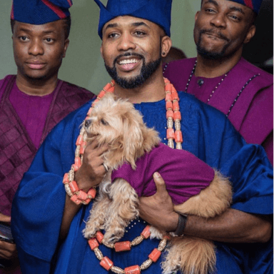 Imagine our collective jealousy when only those who bought the aso-ebis received an access card to attend the wedding. Our sisters at 234Star.com has just increased that sense of jealousy when they pointed out the fact that even Banky’s dog, Duke got an aso-ebi outfit of his own.