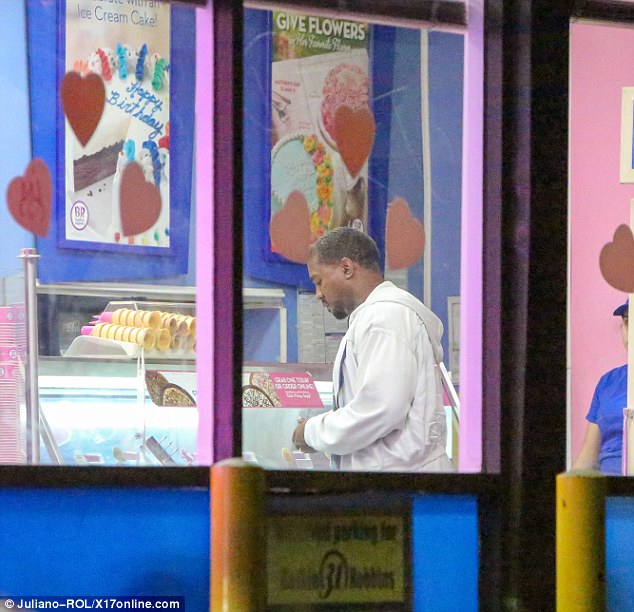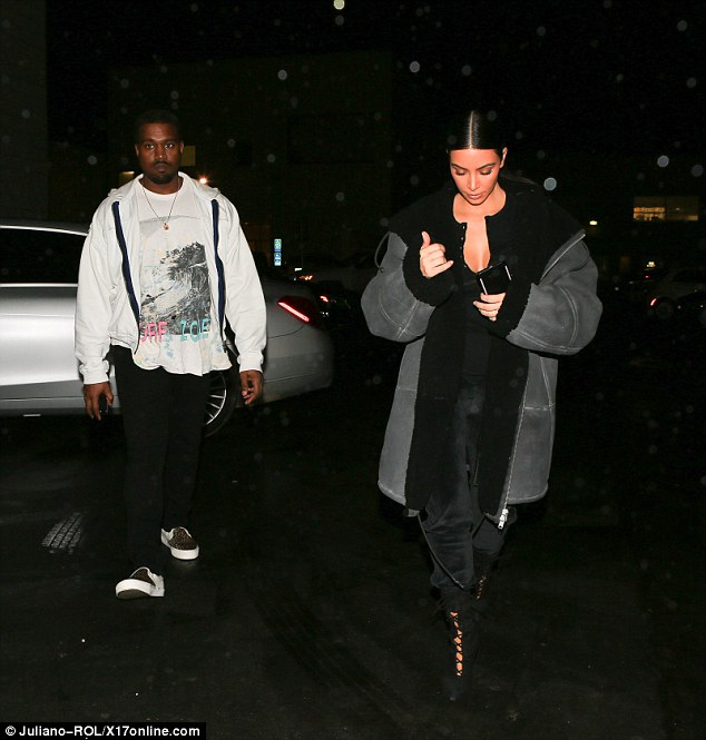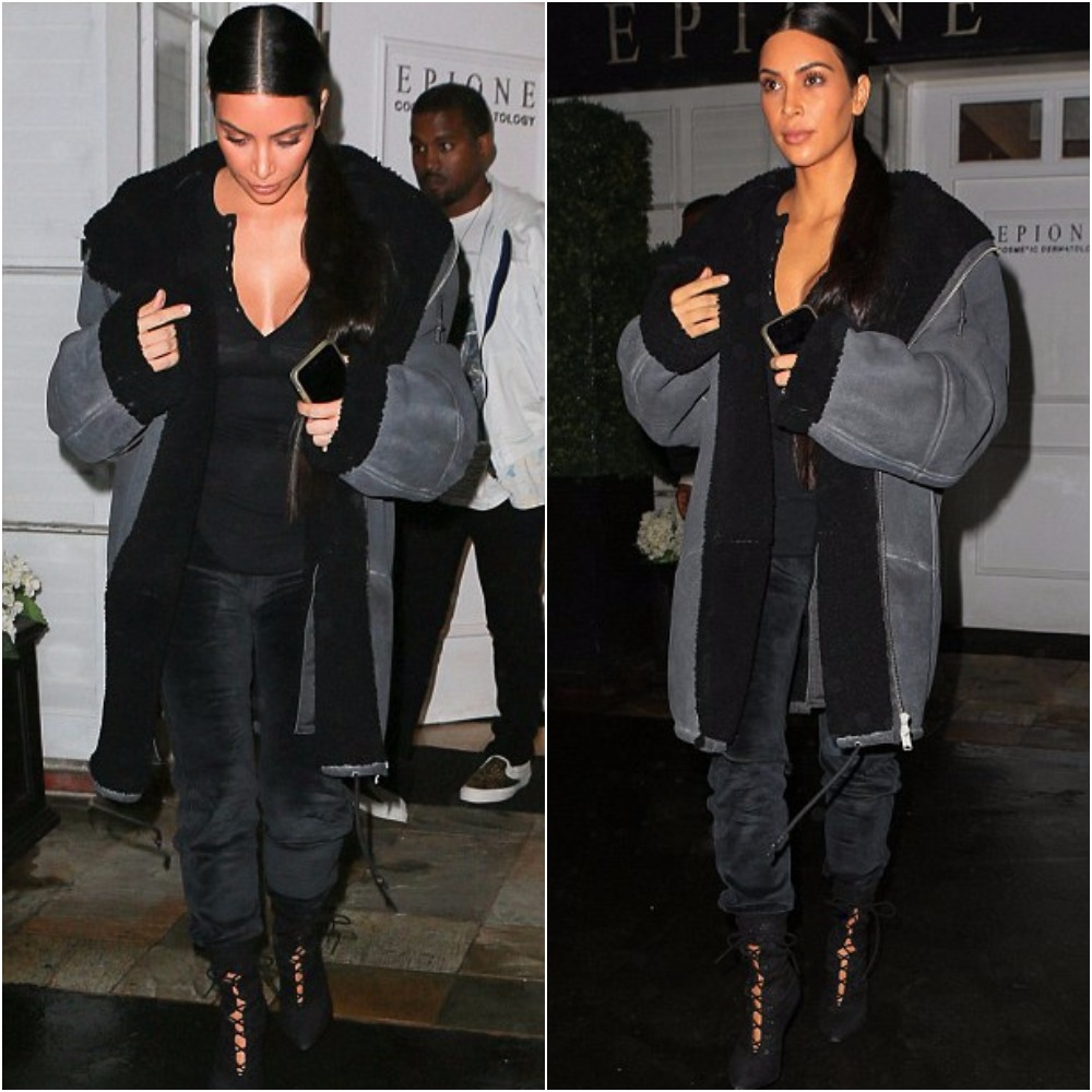 First off, Kim kept it low key in a pair of dark grey sweats, lace up black boots and an over sized grey and black coat.