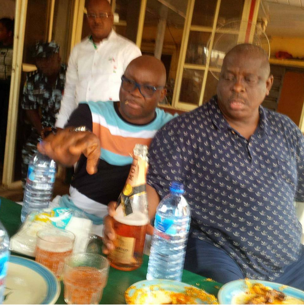 Controversial Ekiti State governor, Ayodele Fayose and Ogun East senator-elect, Buruji Kashamu, were recently spotted having lunch at a local restaurant with a bottle of Champagne to go with the bouts of Amala swallows.
