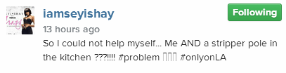 So as a result of, Seyi is embracing the stripper’s pole. Not as a full time stripper of course but she decided to try her skills on the strip pole and she shared the photographs on Instagram with the caption: ‘So I could not help myself. Me and a stripper pole in the kitchen ???!!!! #problem #onlyonLA.’