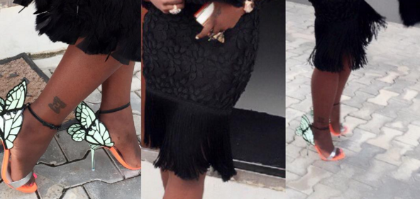 Tiwa, who was clad in a black fringe dress, stylishly showed off the new tattoo on her ‘Ankle’. The tattoo is an inscription of ‘323′, an entertainment company that she co-owns with her hubby, Teebillz.