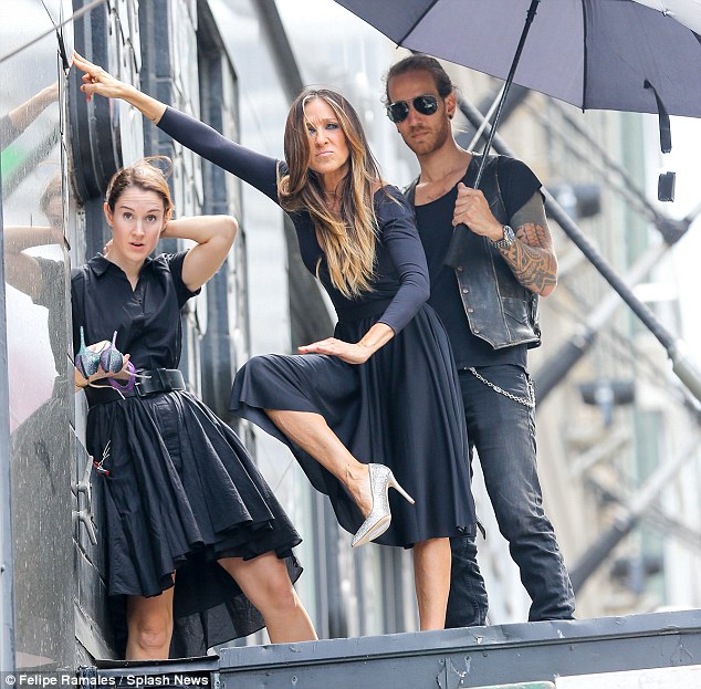 The shoot took place atop the Bloomingdale’s sign in New York City on Monday, May 11, 2015 and the 50-year-old actress wore a flowy black outfit with three-quarter sleeves and a pair of magenta-coloured suede pumps.
