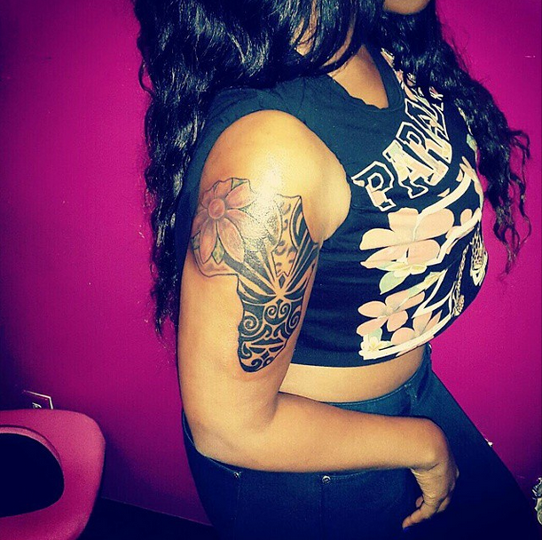 The singer, who is on her way to Malaysia where she’ll perform at the launch of Club Rain alongside Emma Nyra, got inked up while she was in Houston by American tattoo artist, Tattoo Ron who’s believed to charge a minimum of $50 for a tattoo.