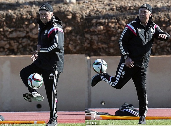 Real Madrid head coach, Carlo Ancelotti was pictured displaying his keepy-uppy skills during a training session with the team on Wednesday, December 17, 2014.