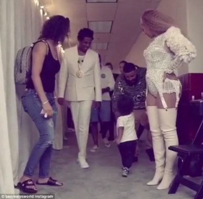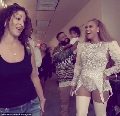 Jay-Z and Beyoncé pictured wearing white attires and they hung out backstage with Khaled, his wife Nicole Tuck and son Asahd who ran around freely as both couples exchanged pleasantries.
