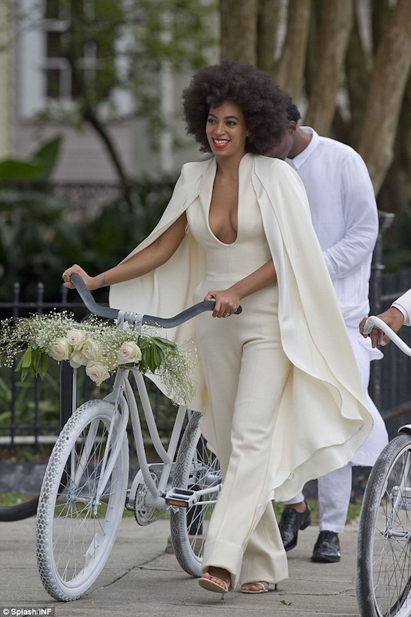 The happy couple – who live in New Orleans with Solange’s 10-year-old son Julez, from a previous marriage – arrived at the Holy Trinity Church on white bicycles, but the 51-year-old groom had to walk part of the way because he got a flat tire, much to their amusement.