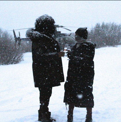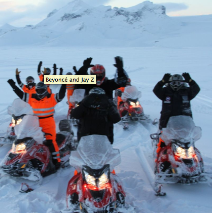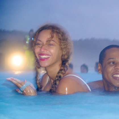 Donning orange ski suits, they rode snowmobiles through the arctic tundra and honoured Mike Brown by posing for a photo with their hands up. The couple took a helicopter ride, sipped champagne in the snow and warmed up with a swim in the hot springs (check out a bikini-clad Bey throwing up the Roc).