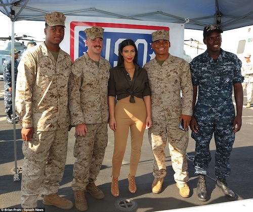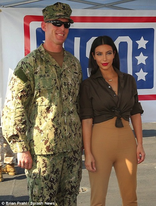 Alongside a picture of herself and a beaming marine, Kim wrote: ‘When I was in Abu Dhabi I stopped by the USS San Diego navy ship to meet the troops. Had the best time seeing everyone (sic).’