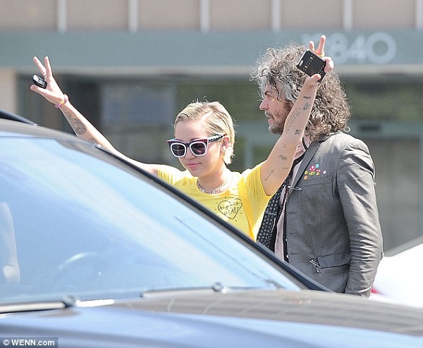 The 22-year-old singer was in a great mood as she walked in the sunshine with her new friend, Flaming Lips frontman, Wayne Coyne, in her bra-less all-yellow outfit.