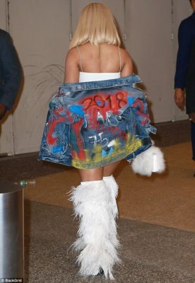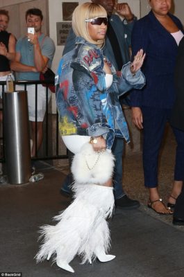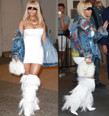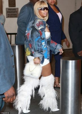 The ‘Ganja Burn‘rapper showed off her exquisite style by wearing a tiny white bodycon dress which she paired with fringed Saint Laurent boots with stiletto heels during her stop by the MTV show.