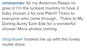 The singer held a baby shower in Nigeria in April with Tiwa Savage, Waje, Lami and others in attendance before heading to the United States of America where she intends to welcome her second child.