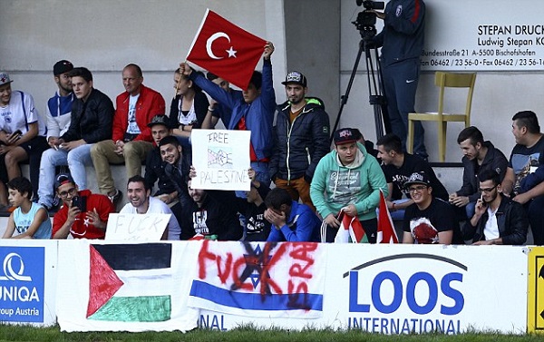 The protesters, seen with Turkey’s flag and banners demanding the freedom of Palestine stormed the football pitch to engage in a fight with the Maccabi players on Wednesday, July 23, 2014.