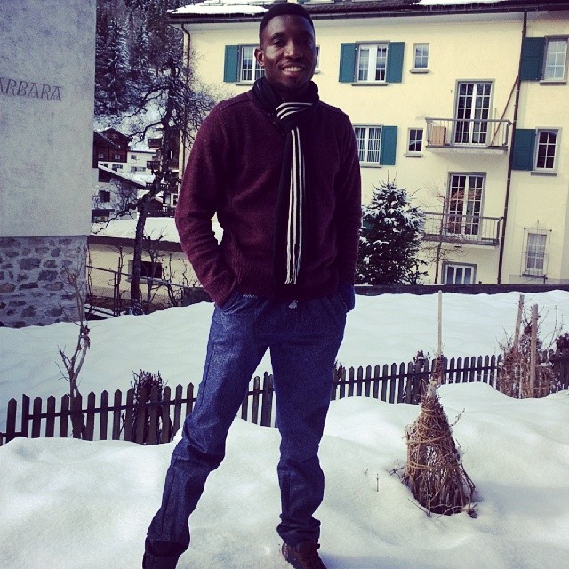 ‘#hangout..#davos..#switzerland. .2 grown nigerian men looking for hot eba in the cold..@cobhams n I…‘, Dakolo jokingly commented.