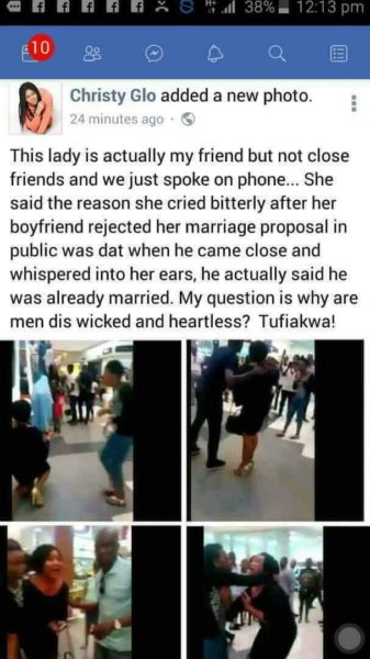 A Facebook user Christy Glo who claims to be the lady’s friend disclosed that the reason the lady cried is the fact that the man was bold enough to tell the lady that he is actually married. That’s what he whispered in her ears.
