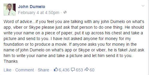 This is why the One Night in Vegas actor took to Facebook account on Wednesday, February 4, 2015 to ask his fans not to pay money to anyone posing as John Dumelo on any social media application especially via What’sApp, Skype and Viber.