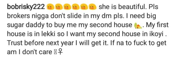Bobrisky took Instagram, posting a photo with the caption, “she is beautiful” warned broke niggas not to slide into her dm. According to her, she needs a rich sugar daddy who will buy her a house in Ikoyi as she already has one in Lekki.