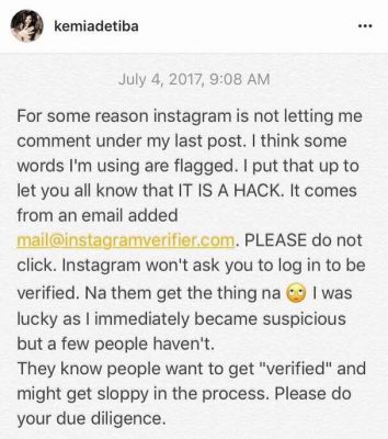 Video director Kemi Adetiba relayed her own experience, saying she got a suspicious email, asking her to log into a website to get ‘verified’. ‘It comes from an email added mail@instagramverifier.com. Please do not click…’ she wrote.