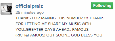 Expressing his joy on the new development, Praiz took to his Instagram page to thank his fans: ‘Thanks for making this number 1!!! Thanks for letting me share my music with you..greater days ahead.. Famous (rich&famous) out soon… God bless you.’