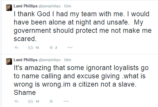 Nigerian singer, Lami Phillips is very angry. The singer claims that her car was properly parked along the Eko Hotel road in Lagos, venue of Goodluck Jonathan‘s Showbiz Interactive Session and her car along with about 9 other cars all had their tires deflated by the entourage of the president.