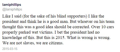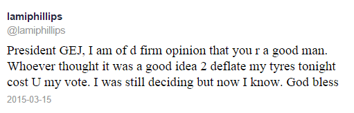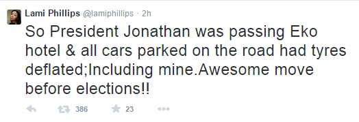 This, move according to Lami, has just cost Jonathan her vote come the presidential elections on March 28, 2015. According to Lami, ‘So President Jonathan was passing Eko hotel & all cars parked on the road had tyres deflated;Including mine.Awesome move before elections’.