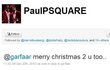 The alleged impersonator’s last tweet was: ‘@garfaar merry christmas 2 u too’ on Saturday, December 25, 2010 and is surprisingly being followed by some other Nigerian celebrities such as Dokta Frabz and Marvelous Benji.