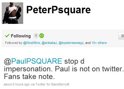 Just this morning, one of the P Square twins, Peter (@PeterPsquare) had to tell off someone impersonating his brother Paul (@PaulPSQUARE).