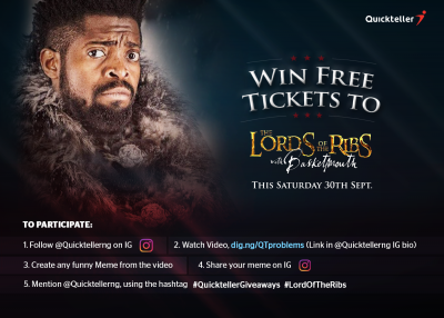 Our darling Quickteller, Africa’s largest online payment platform is giving out 50 FREE TICKETS to the Basketmouth Lords of the Ribs comedy show happening this Saturday 30th September, 2017, at Eko Hotel, Victoria Island, Lagos.