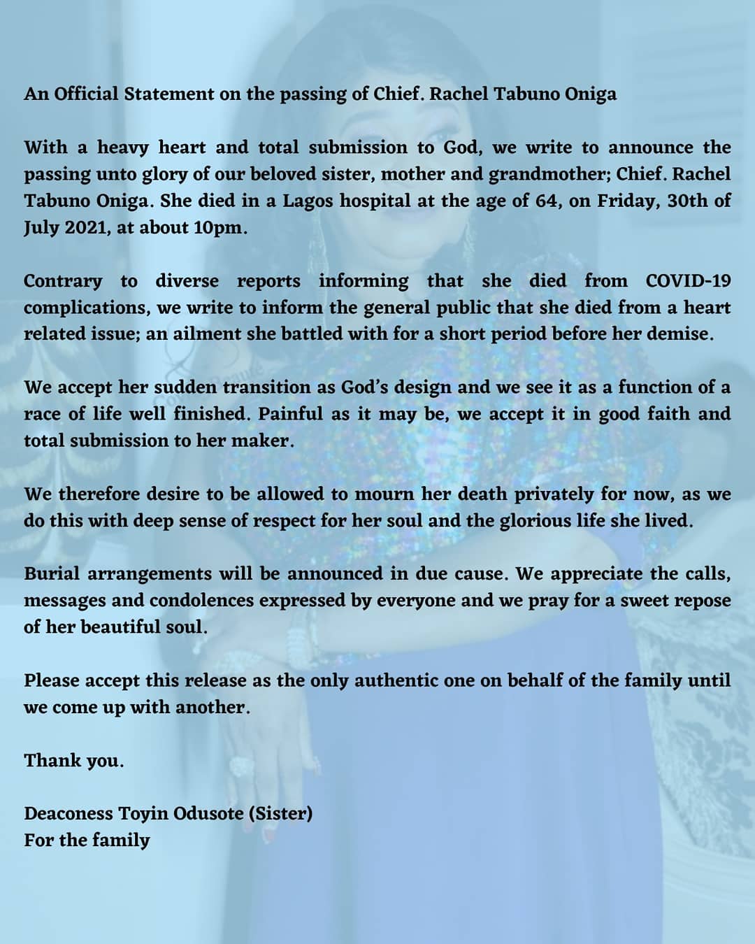 She died in a Lagos hospital at the age of 64, on Friday, 30th of July 2021, at about 10 pm. Contrary to diverse reports informing that she died from COVID-19 complications, we write to inform the general public that she died from a heart-related issue, an ailment she battled with for a short period before her demise.