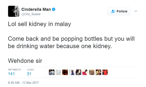 If that’s true, it’s so funny. Remove a kidney to able to afford the drinks/lifestyle to kill the other— Megamind (@Vwede_) March 13, 2017