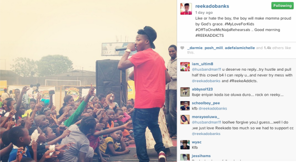 The artiste, who was recently named ‘Rookie of the Year at the Headies on Sunday, December 14, 2014 is still basking in the euphoria of the award, he posted a picture on his Instagram account and captioned: ‘Like or hate the boy, the boy will make momma proud by God’s grace. #my love for kids #off to One Mic Naija Rehearsals.’