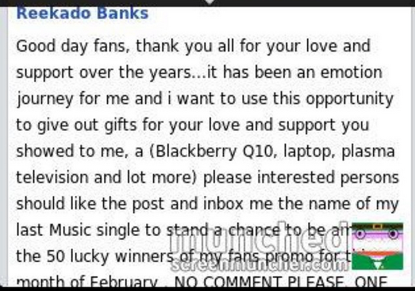 A message on Facebook from a spoof Reekado Banks account has gone viral. The message claims the fast rising music act is running a promo and intends to give out Blackberry phones, Plasma TVs and laptops in appreciation of fans’ support for the Reekado Banks so far.