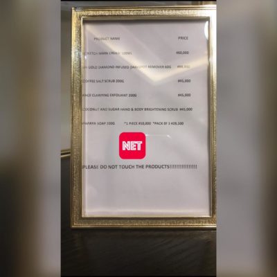 With a glittering array of products at the showroom, NET can reveal that the most expensive product on the list is the “G0ld Diamond Infused Dark Spot Remover”, priced at N98,900 while the cheapest body cream cost N45,000.