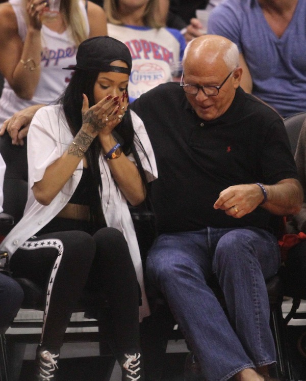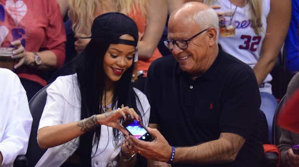 ‘Diamonds’ hit-maker, Rihanna, accidentally broke LA Police Commission President Steve Soboroff‘s mobile phone while trying to take a selfie with him at the Los Angeles Clippers basketball game against Oklahoma City Thunder on Friday, May 9, 2014.