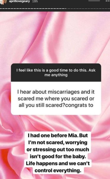 The 23-year-old model shared the information during a Q&A session on her Instagram story when she was asked if miscarriages scared her. She replied saying:“I had one before Mia, But I’m not scared, worrying or stressing out too much isn’t good for the baby.” she went on to add, “Life happens and we can’t control everything.”